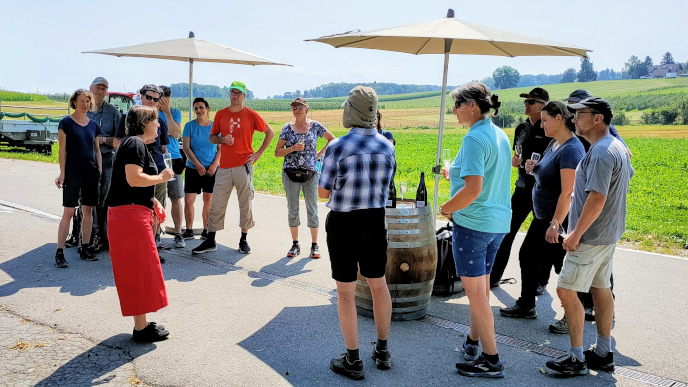 Auf dem Rappenhof genossen wir nach dem Glas Schaumwein das kalte Plättli und lauschten aufmerksam den Ausführungen von Nina Wägeli, die uns fünf verschiedene Weine zur Degustation präsentierte. Der Gruppenleiter (der Schreibende) hatte einige Mühe, die gemütliche Runde zu beenden, denn um 15:00 Uhr erwartete uns bereits Humbert Entress beim Strandbad Hüttwilersee.